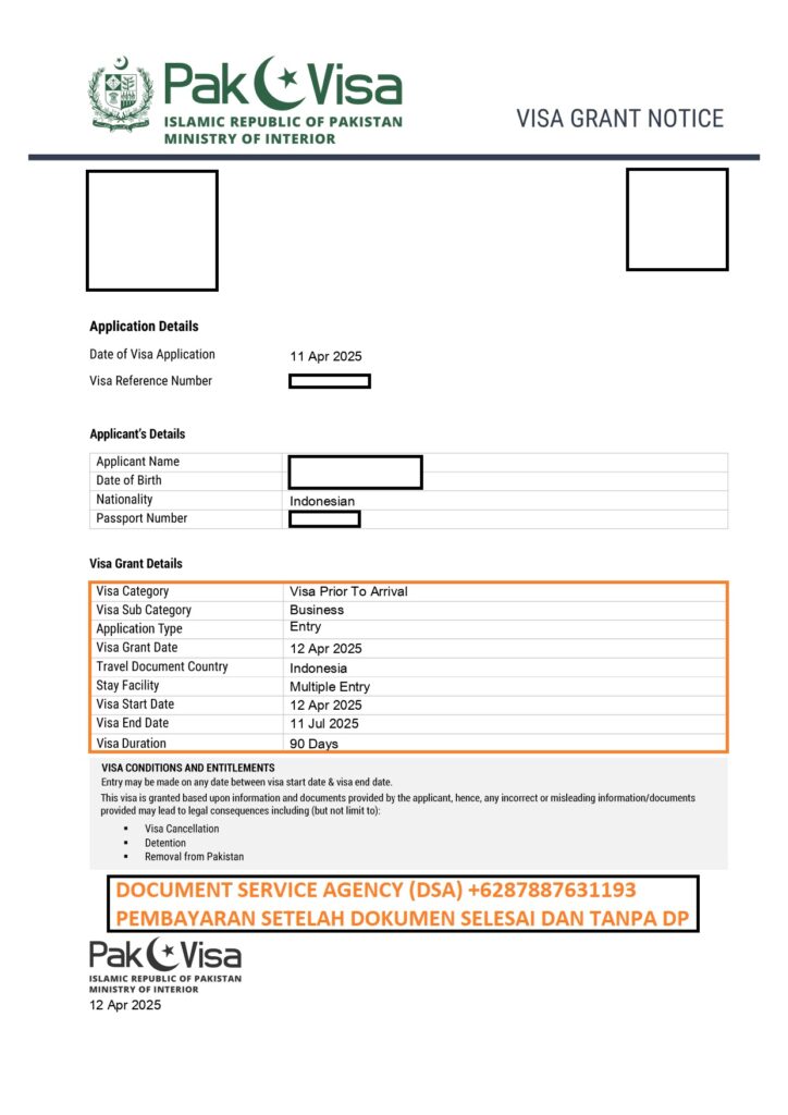 Document Service Agency (DSA) adalah spesialis jasa terjemah, legalisir, atestasi, apostile dokumen dan pengurusan visa terpercaya dan berpengalaman. Bagi anda yang ingin berkunjung ke Pakistan dengan tujuan wisata/ liburan, bisnis atau kunjungan keluarga tidak perlu datang ke Jakarta untuk pengurusan visa atau dokumen lainnya, karena pengurusan visa bisa diwakilkan ke kami. Dengan layanan “Pembayaran Setelah Dokumen Selesai dan Tanpa DP” membuat anda nyaman dan aman menggunakan jasa kami. Dan Dalam hitungan beberapa hari dokumen anda selesai dan siap untuk digunakan.