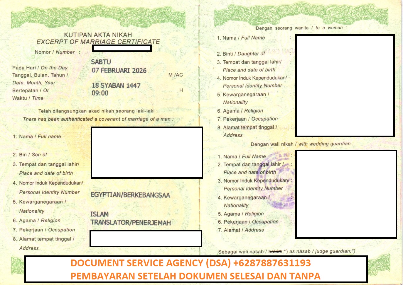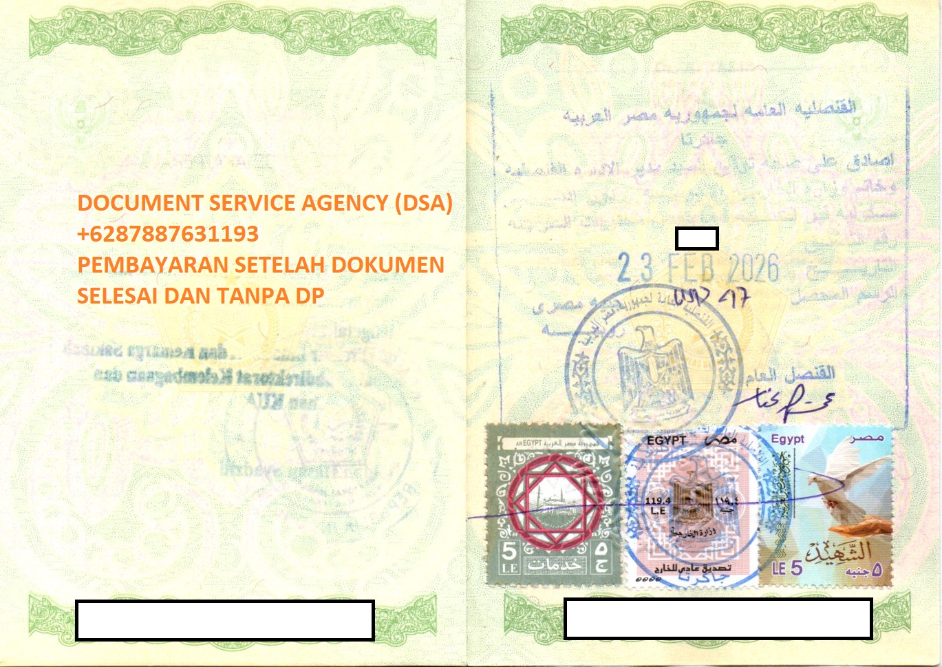 DSA (Document Service Agency) adalah spesialis jasa terjemah, legalisir, atestasi, apostile dokumen untuk keperluan di luar negeri dan pengurusan visa berpengalaman dan terpercaya. Bagi anda yang ingin melegalisir buku nikah di Kedutaan Mesir untuk keperluan pengurusan visa, izin tinggal, pendaftaran pernikahan dan lain-lain. Anda tidak perlu datang ke Jakarta karna pengurusan dokumen anda bisa diwakilkan kepada kami, dengan layanan ” Pembayaran Setelah Dokumen Selesai dan Tanpa DP ” membuat anda lebih nyaman dan aman menggunakan jasa kami.